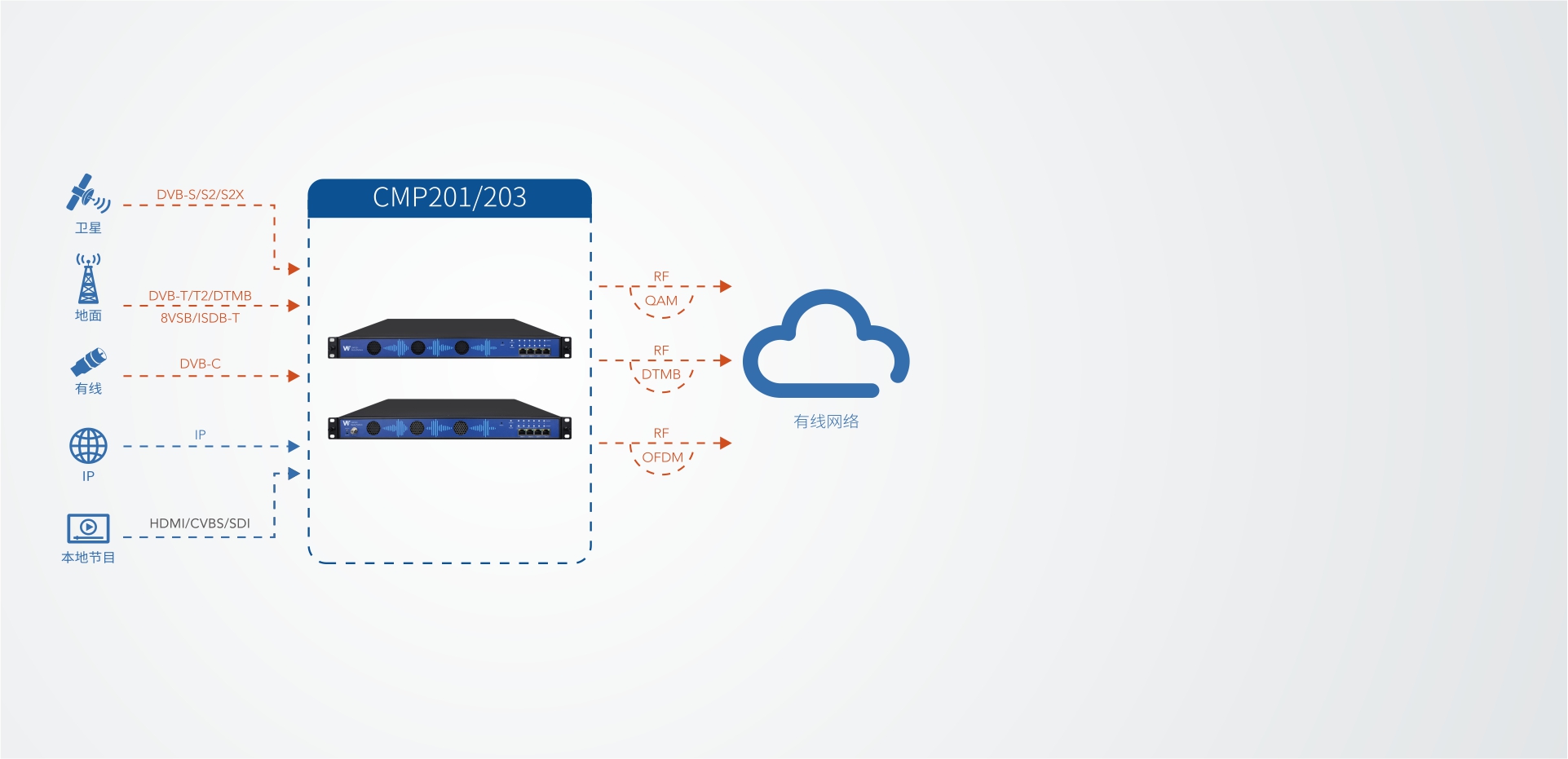 输出:支持 QAM/DTMB/OFDM 等多种调制输出,并具备强大的 IP 处理能力。